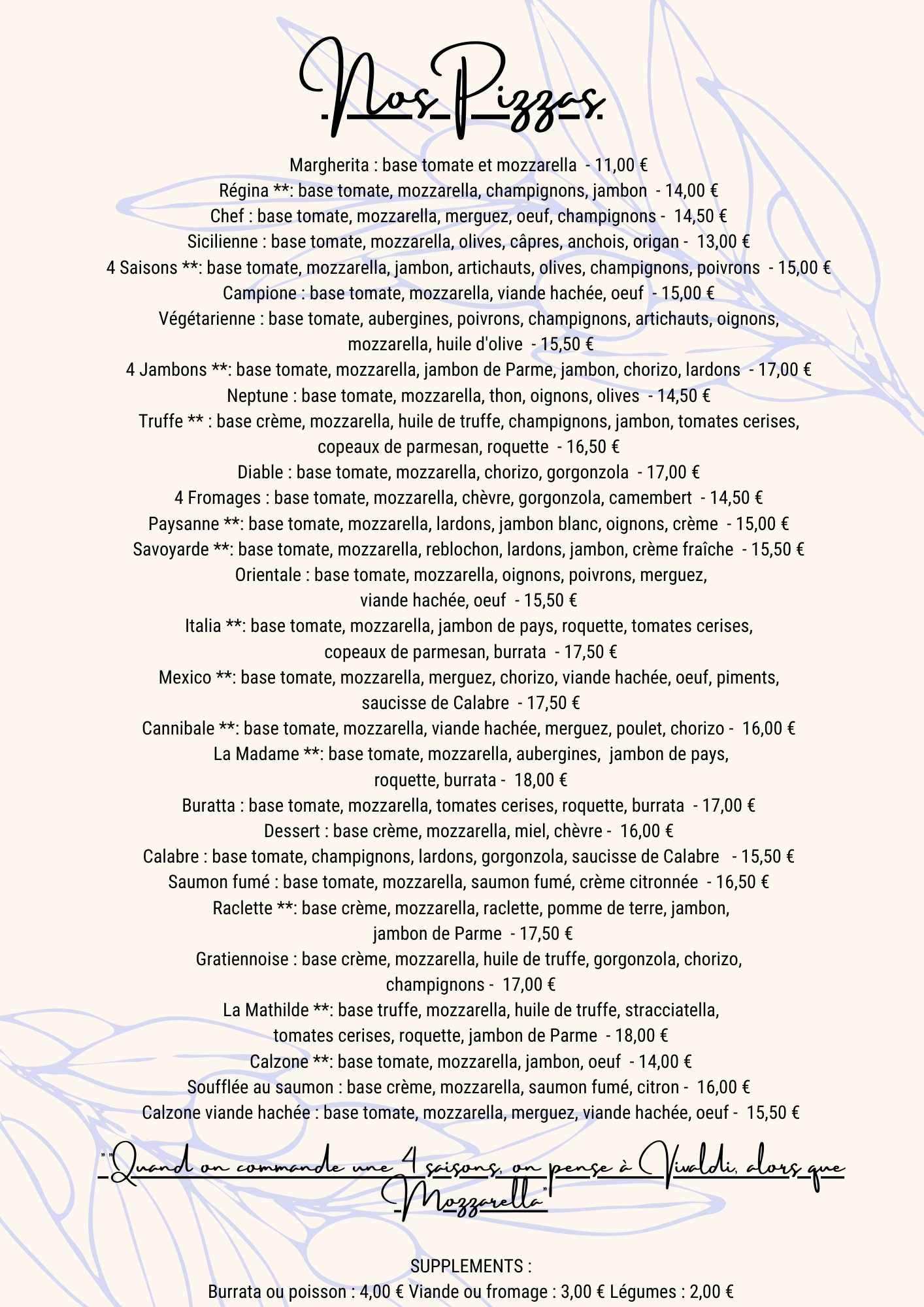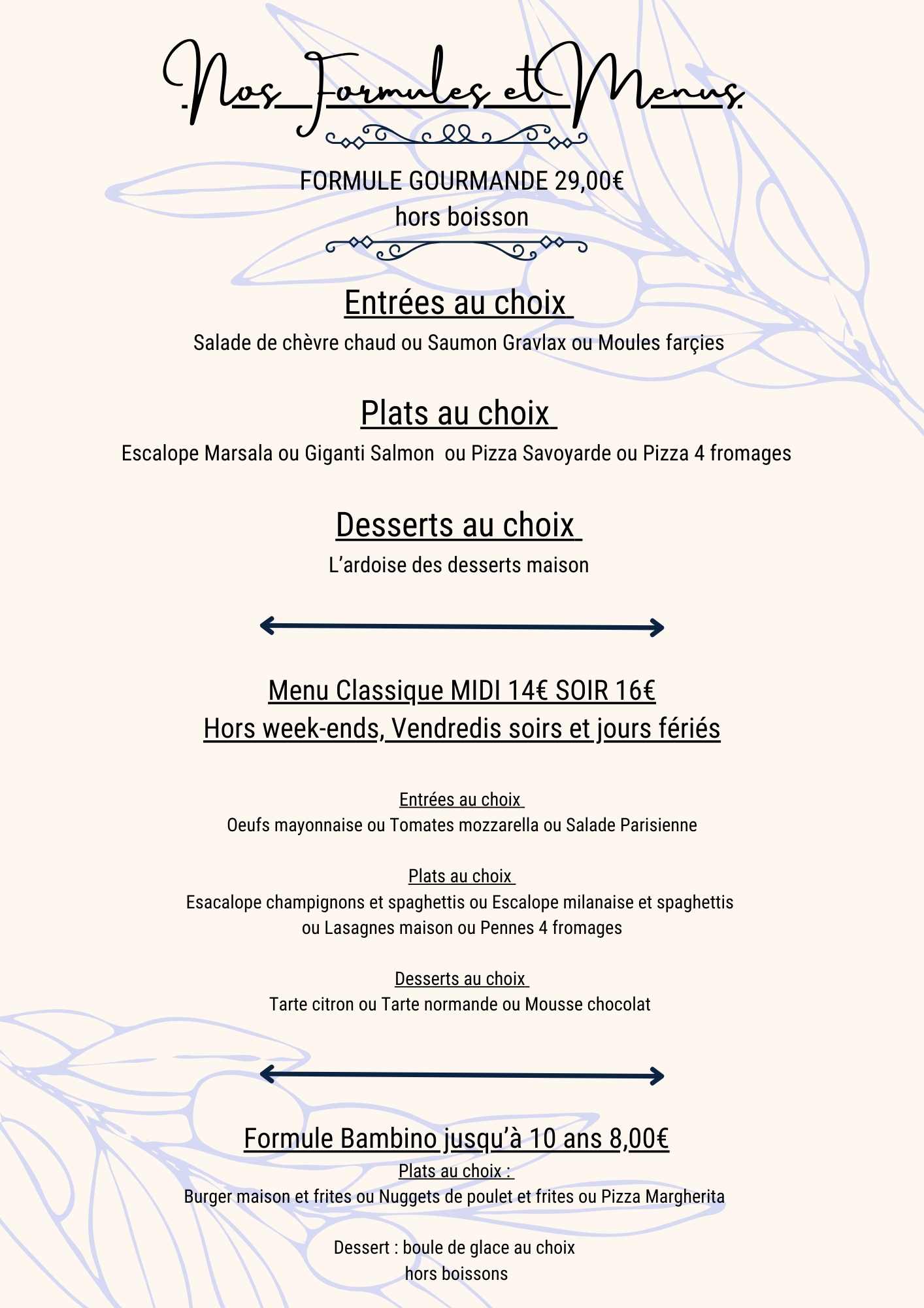 CALL +330139895801Bienvenue à La Terrasse De Mathilde La Terrasse De Mathilde , à Saint-Gratien. Nous avons hâte de vous accueillir. Laissez-vous séduire par notre délicieuse sélection de cuisine française et italienne. Nous mettons à votre disposition un service extérieur et un parking. Nous organisons des événements, n'hésitez pas à nous contacter pour plus d'informations. Nous souhaitons que chacun, quels que soient ses besoins, profite de notre établissement. C'est pourquoi il est conçu pour être facilement accessible. Nous acceptons également vos animaux de compagnie. Un espace fumeur est à votre disposition. Pour le paiement, vous pouvez choisir plusieurs options. N'hésitez pas à nous contacter pour réserver une table.